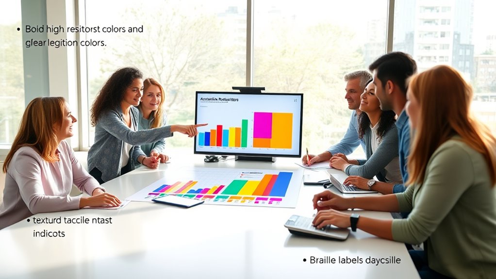 To design accessible charts for inclusive communication, focus on ensuring high color contrast between data elements and backgrounds, avoiding reliance solely on color. Incorporate patterns or textures to differentiate elements and support users with color vision deficiencies. Make sure all interactive features are keyboard accessible with clear focus indicators. Regular testing, especially traversing with a keyboard, helps identify issues early. Continuing will reveal practical tips to make your visuals truly inclusive.