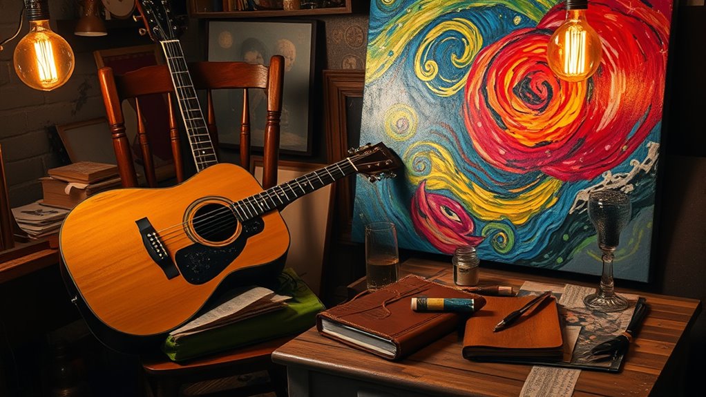 You can see how artists across disciplines inspire each other, fueling creativity and innovation. Imagine a musician inspired by a painter’s bold colors, then composing a piece that captures that vibrancy. Or a writer inspired by a poet’s lyrical language, creating a story that resonates deeply. These cross-inspirations remind you that art thrives on connection. Embrace these influences, and unleash your own creative potential—just like those who’ve turned inspiration into masterpieces.