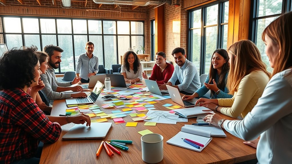 Collaborative workshops are great for boosting your team’s creativity and innovation. They bring people together to solve problems, generate ideas, and build skills through active participation. You can use techniques like mind mapping, round-robin sharing, and affinity mapping to encourage diverse perspectives. Managing team dynamics and creating a positive environment help everyone feel heard and valued. Keep exploring to discover how choosing the right approach can lead to breakthrough solutions and stronger team bonds.