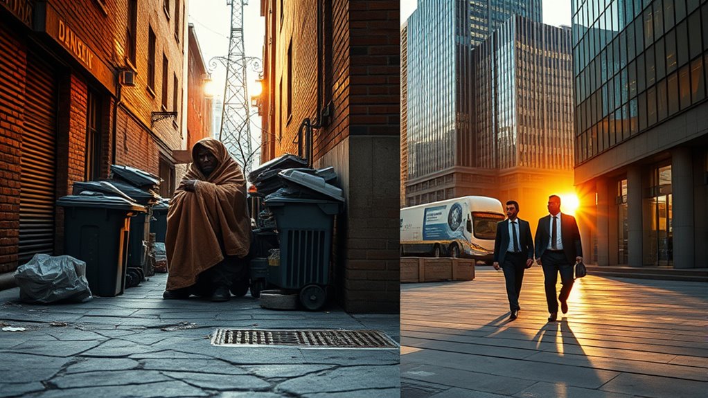 Economic inequality happens when wealth concentrates among a few, making it harder for everyone else to access opportunities like quality education and healthcare. This creates barriers for lower-income groups, reducing social mobility and widening the gap between rich and poor. Policies like fair taxes and investing in public resources can help address these issues. To understand the root causes and discover solutions, keep exploring how these factors shape economic disparity.