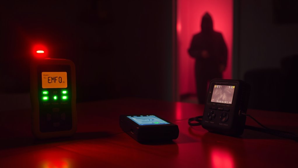 Electromagnetic field meters act like sensitive antennas, catching invisible whispers of electromagnetic anomalies that can signal ghostly presence. When spirits are nearby, they’re believed to disturb ambient electromagnetic fields, causing fluctuations that these meters detect instantly. Using ghost detection techniques, you can monitor these subtle shifts, which may indicate paranormal activity. Think of it as tuning into a ghost’s secret radio station, revealing their unseen dance within your environment.
