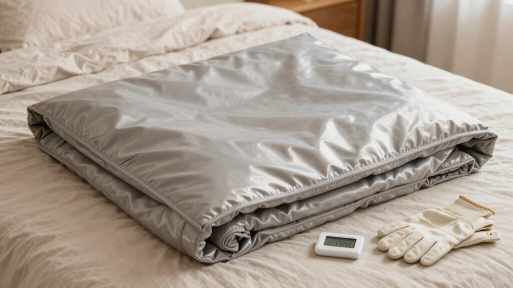 Proper storage and regular maintenance are essential to keep your infrared sauna blanket functioning effectively and lasting longer. When stored properly, your blanket maintains its aesthetic improvements by preventing wrinkles, discoloration, and fabric wear. Fold or roll it gently, avoiding sharp creases that could damage the material. Keep it in a cool, dry place away from direct sunlight to protect against UV damage and material degradation. Clean it regularly according to manufacturer instructions to preserve material durability and hygiene. Check the control panel and wiring for signs of wear or loose connections. Proper maintenance not only extends the lifespan but also guarantees consistent heat performance, keeping your sauna blanket in top condition for many relaxing sessions.