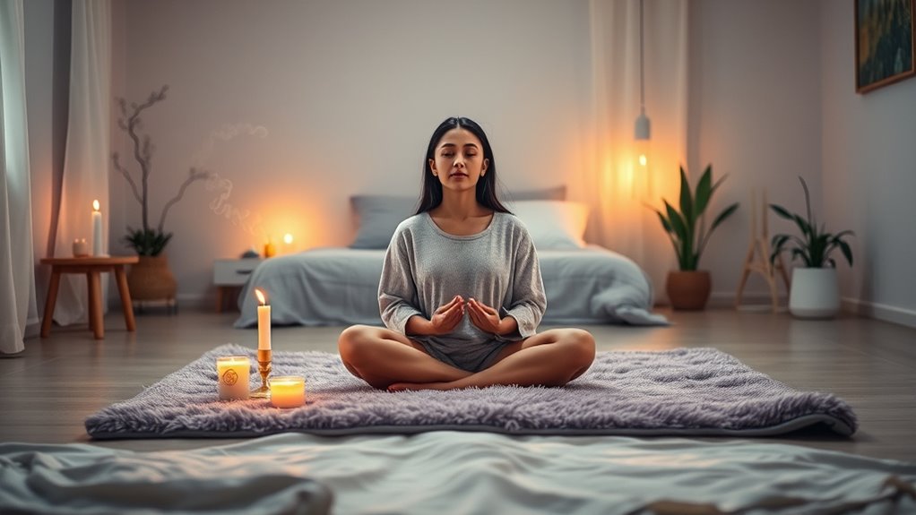 To improve your sleep with meditation, try focusing on mindful breathing—pay attention to your inhales and exhales slowly and deeply. Visualize calming images, like a peaceful beach or forest, to quiet your mind. Incorporate these techniques into your nightly routine, dedicating a few minutes in a quiet space. Consistent practice helps reduce racing thoughts and makes it easier to fall asleep. Keep exploring, and you’ll find more effective ways to achieve restful nights.