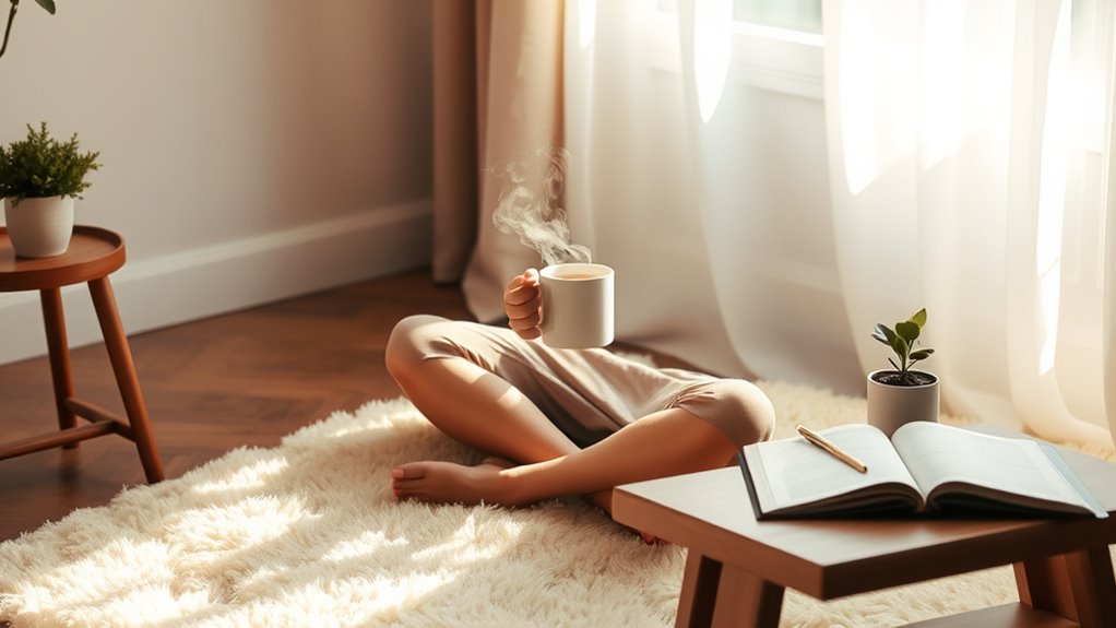 Practicing mindful living means being fully present during everyday activities like eating, walking, or working. You can start by focusing on your breath or the sensations around you, sinking into each moment without judgment. This habit helps you become more aware of your thoughts and feelings, fostering calm and clarity throughout your day. As you continue to explore mindful routines, you’ll find it easier to stay centered and enjoy each activity more deeply.