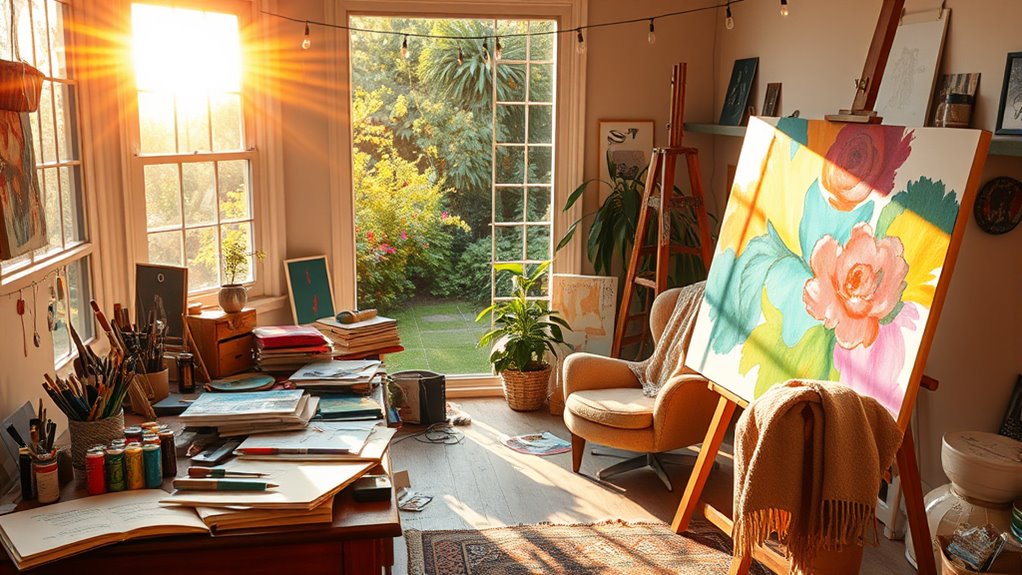 When facing creative blocks, try simple mindfulness exercises like focused breathing or body scans to clear your mind and reduce stress. Changing your environment—like moving outdoors or rearranging your workspace—can also spark fresh ideas. Combining these approaches helps you reconnect with your creativity by breaking mental patterns and clearing clutter. Small acts such as walking or tidying up can make a big difference. To explore more effective strategies, keep going—you’re closer than you think to reigniting your inspiration.