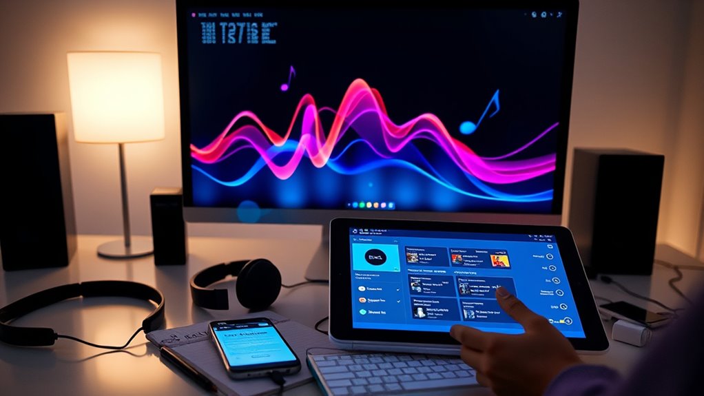 Creating personalized playlists with machine learning involves analyzing your listening habits to generate tailored music recommendations that adapt over time. By recording actions like skips, pauses, and repeats, the system identifies your preferences and recognizes patterns such as favorite genres or moods. Advanced algorithms then curate playlists that align with your evolving tastes, ensuring a seamless listening experience. Keep exploring to discover how these smart systems continuously refine your musical journey for a truly personalized sound.