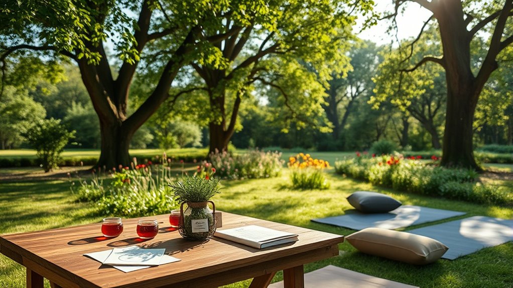 To plan a successful wellness retreat, focus on creating a balanced program that combines relaxation activities like guided meditation, breathing exercises, and yoga nidra with nourishing, organic meals tailored to your guests’ needs. Choose a peaceful venue surrounded by nature to foster mindfulness and tranquility. Guarantee the schedule includes free time for reflection and incorporate calming decor to enhance the experience. If you keep exploring, you’ll discover how these elements come together to make a truly transformative retreat.
