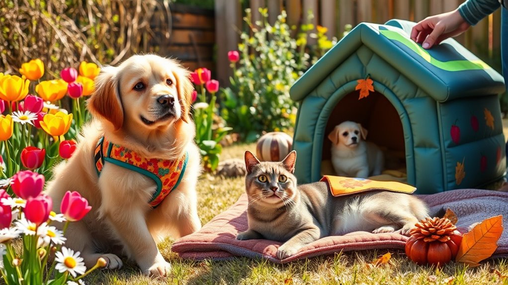 To keep your pets safe year-round, adjust grooming routines for each season, like trimming coats in summer and maintaining them in winter for insulation. Be mindful of holiday hazards such as decorations and toxic foods, and modify outdoor activities during extreme weather. Guarantee they have cozy bedding or cooling mats, access to fresh water, and proper supervision. Staying proactive with environment management and safety measures helps protect your pets; explore the next tips to learn more.
