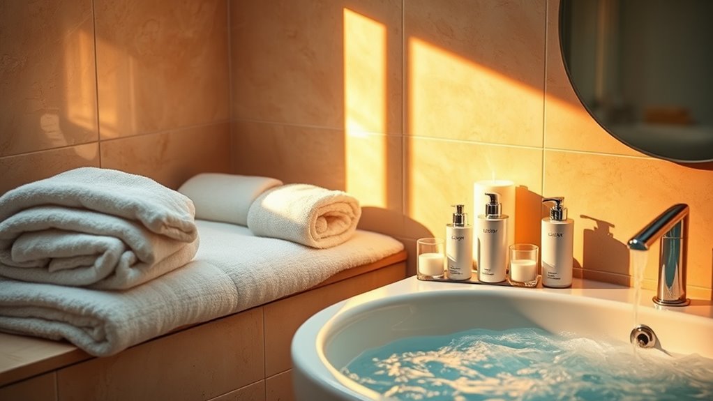 To incorporate indulgent self-care routines, you can start with quick relaxation techniques like deep breathing or stretching during breaks. Embrace mindful indulgence strategies by savoring a cup of tea or applying a luxurious skincare product without distractions. Schedule small, regular moments for yourself, even if just for a few minutes, to recharge and enjoy your favorite rituals. These simple steps help turn self-care into a meaningful, indulgent part of your busy day.