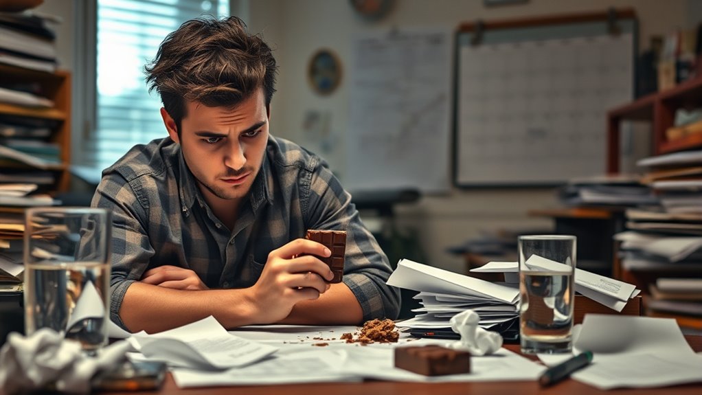 Stress releases cortisol, a hormone that encourages fat storage, especially around your belly, often without you realizing it. It also triggers cravings for comfort foods high in sugar and fat, leading to emotional eating and excess calorie intake. Poor sleep caused by stress further disrupts hormones that control hunger, making unhealthy choices harder to resist. Managing stress can break this cycle and support your weight goals. If you want to understand how to better control stress and stay healthy, keep exploring these connections.